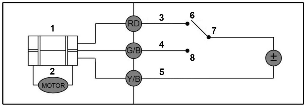 Die Motoransteuerung erfolgt über einen Wechselschalter. Der Antrieb läuft jeweils von einem Endpunkt zum anderen Endpunkt und schaltet dann den Motor ab. Bei Stromausfall, bleibt der Motor in der Stellung stehen, in der er sich gerade befindet.