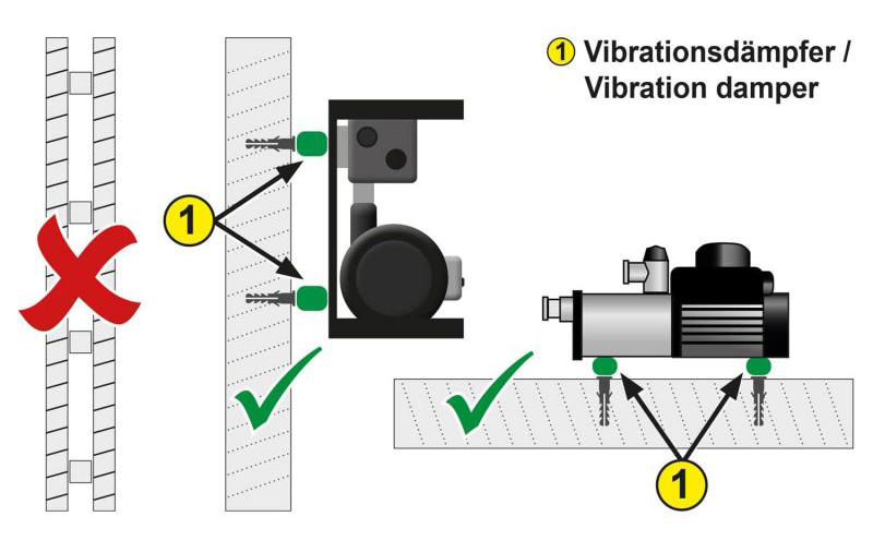 Bitte installieren Sie die Pumpe an einer massiven Wand oder einem geeigneten Untergrund. Die Pumpe darf nicht an Hohlraum- oder Gipswänden befestigt werden, da dies die Vibrationen verstärkt und die Pumpe dadurch beschädigt werden kann, wobei die Betriebsgeräusche der Pumpe erheblich zunehmen. Verwenden sie für die Installation stets Vibrationsdämpfer, um Schäden an der Pumpe zu vermeiden.