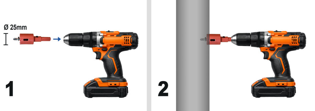 Führen Sie den Bohrer in das Bohrfutter ein und spannen Sie ihn fest (1). Bohren Sie Ihr Fallrohr an (2). Beachten Sie, dass die Höhe des Bohrlochs immer oberhalb der Höhe des Anschlusses an Ihrer Regentonne liegen muss. Nur so wird ein gleichmäßiger Wasserdurchfluss durch den Regensammler gewährleistet.