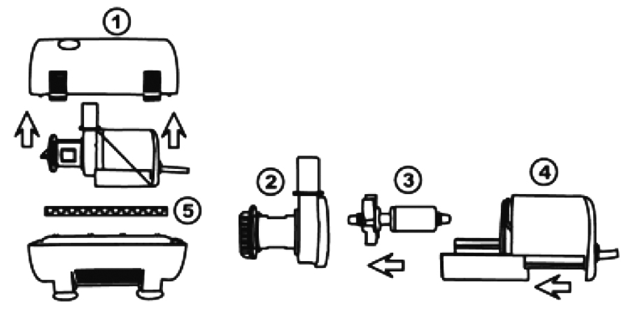 Die Pumpe sollte in regelmäßigen Zeitabständen, abhängig vom Verschmutzungsgrad des Teiches, von Sedimenten und Ablagerungen gereinigt werden (siehe Abb. Abbildung ähnlich). Um das Pumpenlaufrad zu säubern, entfernen Sie am Pumpengehäuse die vordere Kunststoffabdeckung (siehe Abb.)