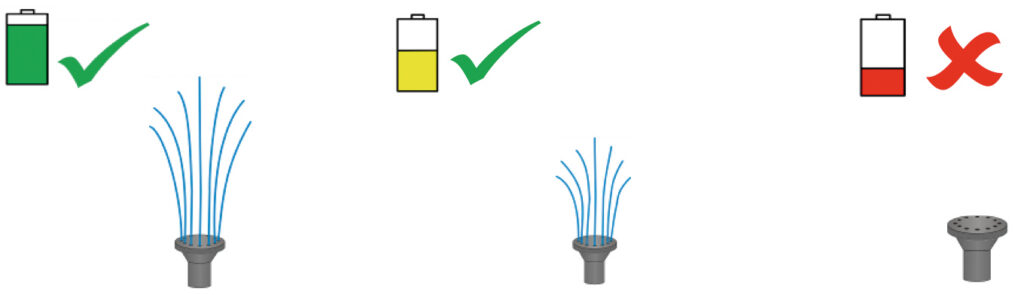 Die Leistung der Pumpe hängt von der Ausrichtung des Solarpanels zur Sonne und deren Intensität ab. Die max. Leistung wird bei optimalen Bedingungen im Sommer und teilweise im Herbst und Frühjahr erreicht. Eine Funktion im Schatten oder bei bewölktem Himmel kann nicht garantiert werden. Bei Modellen mit Akku-Betrieb hängt die Funktion vom Ladezustand der Akkus ab.