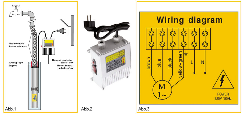 Montieren Sie die MOTOR-SCHUTZSCHALTER-BOX (NUR IM LIEFERUMFANG DER BRUNNEN-STAR 750-4 ENTHALTEN) an einer entsprechend der Schutzklasse geeigneten Stelle. Sorgen Sie dafür, das in Montagenähe eine mit 30 mA FI-Schutzschalter abgesicherte Steckdose vorinstalliert ist. Installieren Sie die das Pumpenkabel in der Schutzschalter-Box. Führen Sie das Kabel durch die dafür vorgesehene Verschraubung von außen in die Box. Die Drähte sind mit Zahlen markiert. Schließen Sie diese an die elektr. Klemmleiste entsprechend der Nummerierung an (Siehe Abb. 3). Ziehen Sie die Verschraubung der Kabeldurchführung fest und verschrauben Sie den Deckel. Achten Sie dabei auf den ordentlichen Sitz der Deckelgummidichtung.